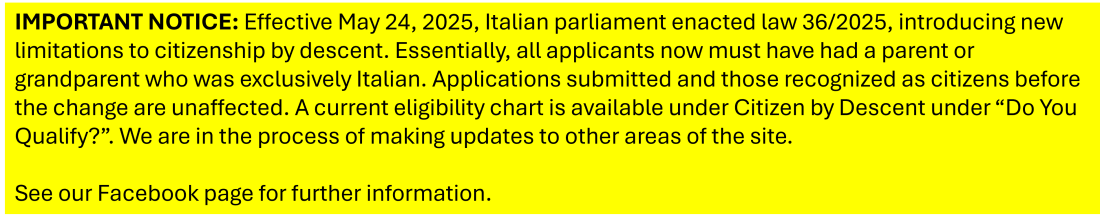 The administrators and moderators of the Dual U.S.-Italian Citizenship Facebook Group are not lawyers and as such cannot provide concrete legal advice surrounding any one person’s unique situation or topic; any and all comments and posts are the opinions of their respective owners and are NOT to be construed as legal advice. We do not make any warranties about the completeness, reliability and accuracy of this information. Any action you take upon the information provided is strictly at your own risk. Therefore, by your active use of this site and/or the associated Dual U.S. Italian Citizenship Facebook group, you shall release its members, administrators, and moderators of any liability or other legal claim made through civil, state or federal lawsuit. If at any point you choose to discontinue your membership in this group and/or cease use of this website and all its pages herein, all terms of your aforementioned release of liability shall apply. Finally our group makes no guarantees concerning the success of your application to the consulate or the favorable outcome of any legal action undertaken. All decisions regarding dual citizenship applications are at the sole discretion of the Italian government authorities reviewing the application. All statements by our group are statements of opinion only.