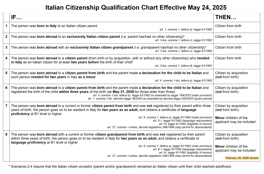 In order to establish your claim of citizenship, you’ll need documents (vital records) supporting the descent of each person in your line back to the parent or grandparent you are claiming citizenship through. For applicants born outside Italy claiming citizenship by descent (scenarios 2-4 below), you’ll also need documents establishing whether and when your LIBRA (Last Italian-Born and Registered Ascendent) naturalized, showing that he or she did not lose Italian citizenship before the next person in your line became an adult. In addition, all recognized Italian citizens are required to keep their home comune up-to-date with any changes in their status, such as marriage, divorce, or the birth of their children.